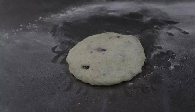 ③ 取出發酵好的面團,用手拍扁,折成橄欖型