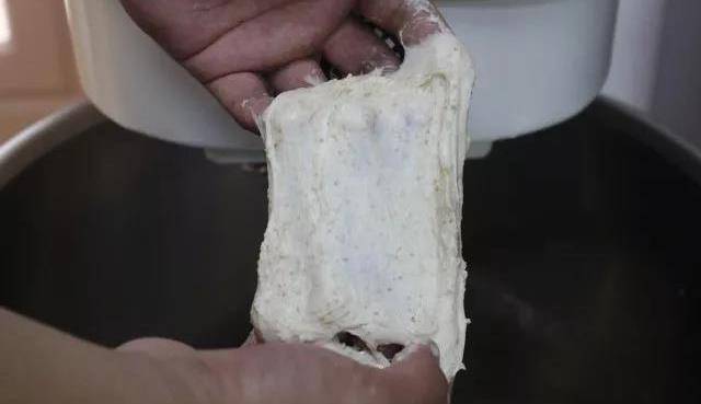 ② 在面團中加入液種後,慢速攪拌均勻,快速攪拌1分鐘後,攪拌至面團光滑,面筋7成,可以拉出粗糙的膜
