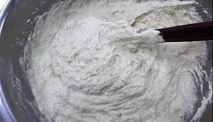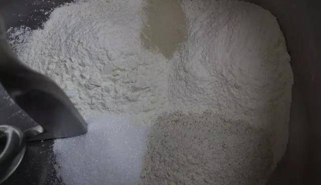 ① 將酵母、糖、面粉都倒入攪拌桶中,攪拌均勻,然後加入水攪拌至無幹粉狀態