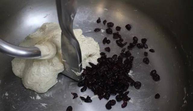 ③ 然後加入黃油和鹽,再慢速攪拌至黃油和鹽至完全吸收,面筋9成,可以拉出細膩的薄膜,再加入蔓越莓幹,攪拌均勻。