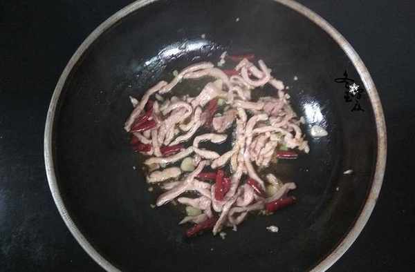 6.下入肉絲翻炒至顏色變白