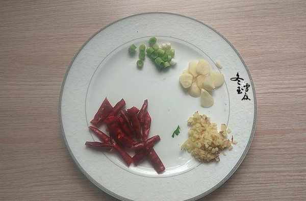 輔料:植物油3湯匙、鹽4克、蔥1段、薑2片、大蒜2瓣、料酒1湯匙、醬油1湯匙、幹辣椒5個、