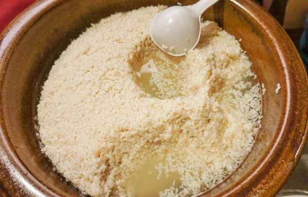 以前的做法古老而簡單,準備一個大瓦缸,幾床厚棉被,將糯米泡漲蒸熟,蒸熟冷卻後揉一揉,撒上磨好的酒曲粉,放入瓦缸中密封,厚棉被包裹結實,放置一周就發酵成醪糟瞭。