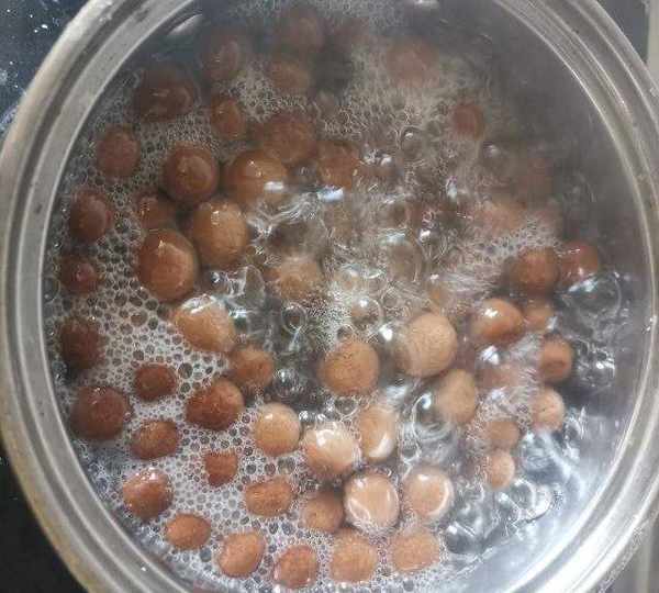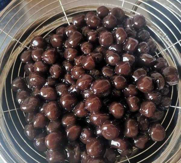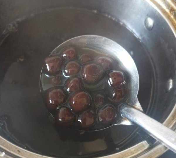 第25步、將紅糖珍珠撈出放涼開水中浸泡一會更Q彈,軟韌有嚼勁的紅糖珍珠就做好瞭。