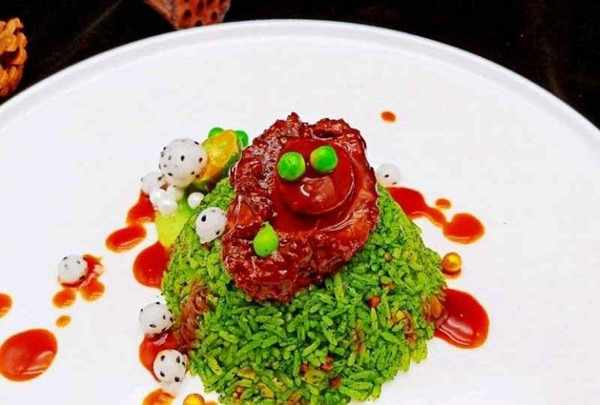 發好的幹鮑1隻、香米200克、香菇丁5克、黃椒丁5克、胡蘿卜丁5克、菠菜葉250克、蜜豆、火龍果、二湯500克、蠔油3克、老抽5克、藏紅花適量、味精5克、雞汁5克、雞粉5克、老母雞香料適量、雞油8克、生粉、冰糖水3克、豬油10克、花生芽