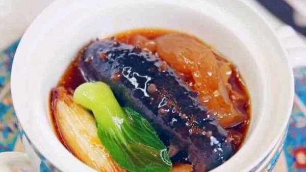 熱鍋放入底油、蔥段煎至金黃出香,依次放入濃湯、海參、蹄筋、調味料
