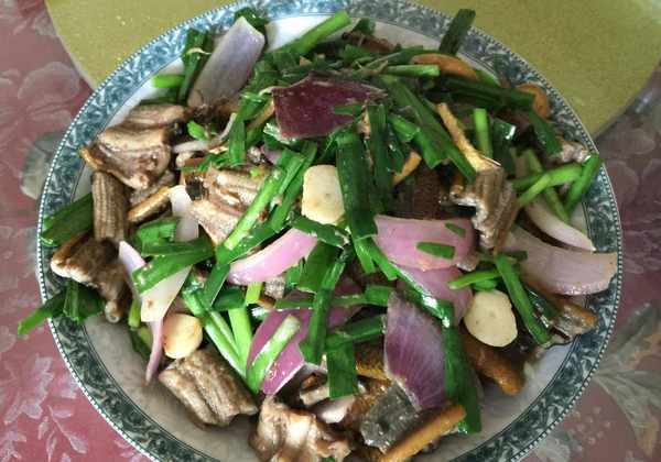 春蒜炒雞胗:春蒜對半切開,胡蘿卜和小蔥,辣椒切好,雞胗趁著半凍的時候,切薄一點的片,雞蛋加鹽煎成餅,放在盤子裡,先炒胡蘿卜和雞胗,等到雞胗變色時,加入其餘材料,翻炒幾下,加鹽就行瞭,特別的美味。
