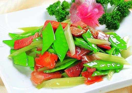 荷芹炒臘味:鍋中放入500g水燒沸,下臘肉燙1.5分鐘撈出瀝幹備用,原湯中放入西芹片燙30s,再下荷蘭豆燙30s,一起撈出瀝幹待用;鍋中放入15g油(約兩湯匙)燒熱,下臘肉片炒出香味,放入西芹、荷蘭豆和紅椒片;根據個人口味調入小炒料包,炒勻即可。