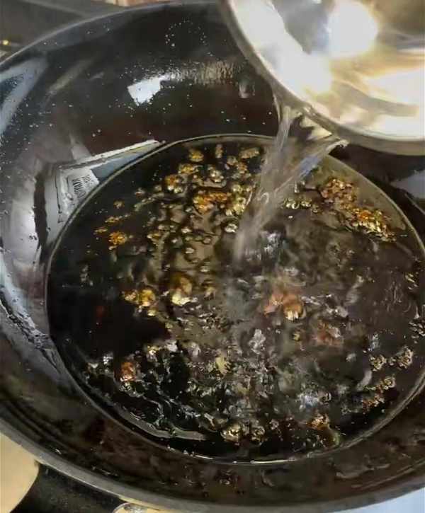5.熬至深棗紅色以後,再慢慢地加入幾勺開水,這是第二次加水,註意一定要是開水,如果是涼水會有炸鍋的危險,即使是開水也要註意安全,要沿著鍋邊慢慢的加入。加入開水後攪動均勻,然後再放在火源上煮5分鐘,讓水和糖能夠充分的融合,以達到顏色紅亮,糖水不分離,不苦不甜的效果。