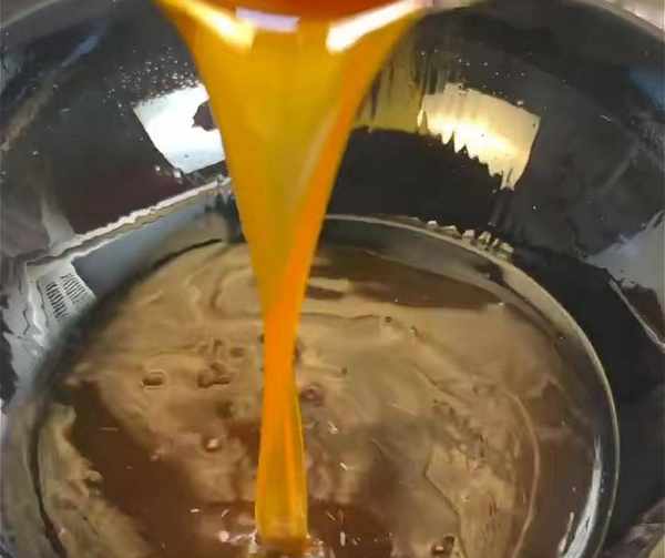 3.然後就繼續的攪動,待顏色熬制顏色發黃的時候這個時候最適合來給菜品拔絲用,比如拔絲香蕉,拔絲紅薯,拔絲蘋果等。
