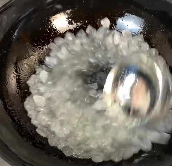 2.熱鍋冷油,下入冰糖和少量的水,水的加入可以防止開始熬的時候過火而糊掉,這也是第一次加水,然後小火就用勺子不停的攪動,讓冰糖慢慢的融化然後起白泡,這個時候的糖漿最適合用來給菜品掛霜用,比如掛霜花生等。