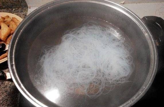 水開,放入粉絲,煮至你喜歡的口感,即可關火。粉絲過長,可以用刀或剪刀,隨意的來個兩三刀。