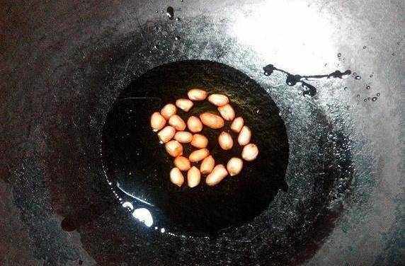 趁著這個時間,把花生米酥出來:冷鍋冷油,下花生米,用最小火,酥至花生米外皮上色,即可撈出。