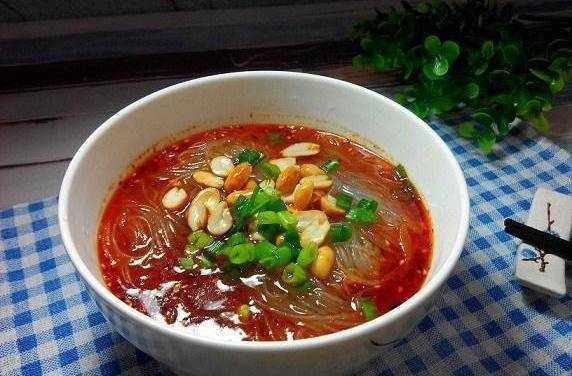 面碗裡來兩大湯勺煮粉絲的湯,挑入粉絲,隨後撒上些許酥花生和蔥花,搞定,吃吧!