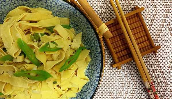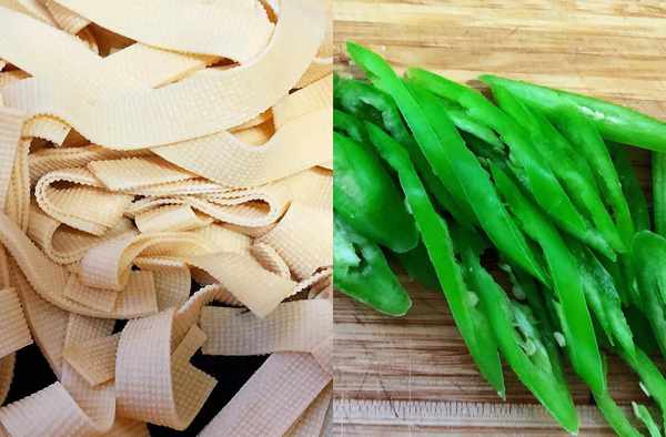 1、豆腐皮3張和螺絲椒1個用水洗凈切絲。