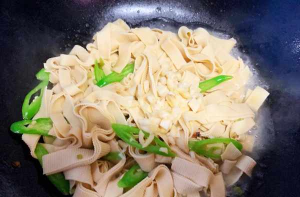 3、辣椒不要提前下鍋,待湯汁濃鬱後再下鍋翻炒,可以讓辣味微微融入豆腐皮中,辣椒還能保持脆嫩的口感。