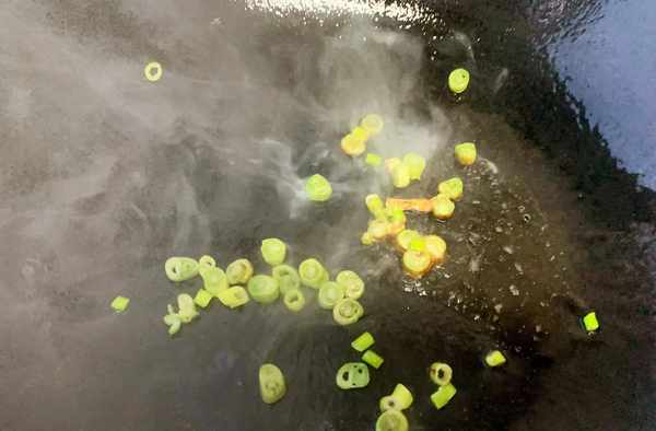 2、鍋燒熱後倒入食用油,下蔥花爆香。