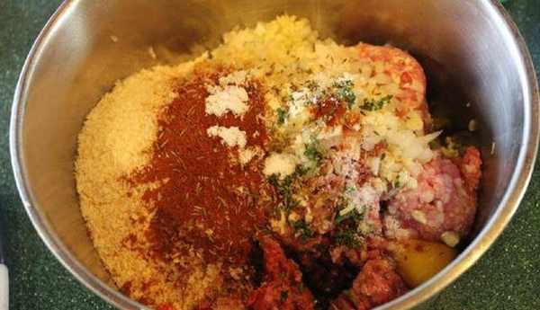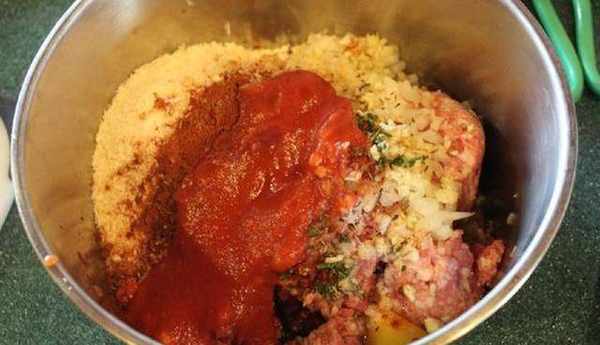 牛肉餡:400g、豬肉餡:400g、洋蔥碎:150g、大蒜碎:15g、新鮮迷迭香:2-3枝,切碎(用幹燥迷迭香也可以)、百裡香:一些、小茴香:一些、面包粉:50g、雞蛋:1個、紅椒粉:4g、辣紅椒粉:4g、鹽:適量、蕃茄糊:3大匙、紹興酒:2大匙、面粉:一些,沾肉丸外表用