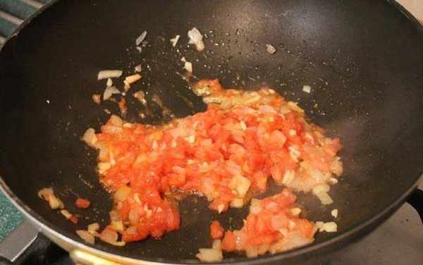 大蒜末2瓣+蕃茄丁2顆+洋蔥碎1/4顆,炒軟。