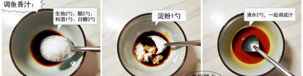 碗裡分別加入生抽2小勺、醋2小勺、料酒1小勺、白糖2小勺、淀粉1小勺、清水2小勺調成魚香汁備用;