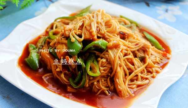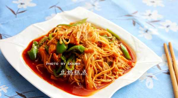 加入金針菇,炒散,並翻炒均勻;