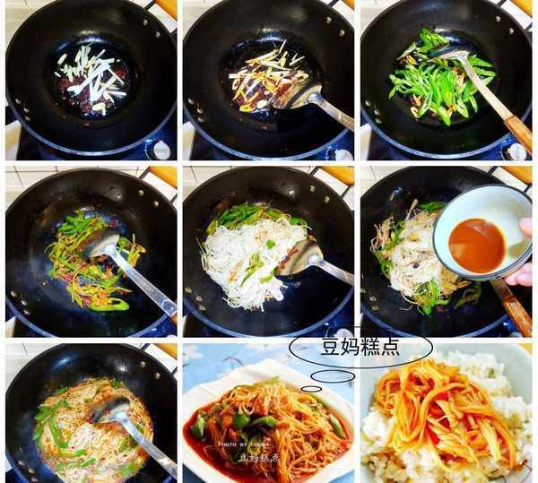 做魚香菜時,一般愛放些胡蘿卜絲、黑木耳,每樣所需並不多,所以豆媽在做的時候,偷懶給直接改放青椒瞭,味道一樣贊哦。