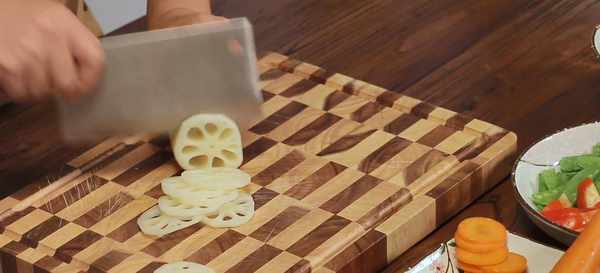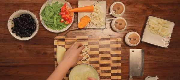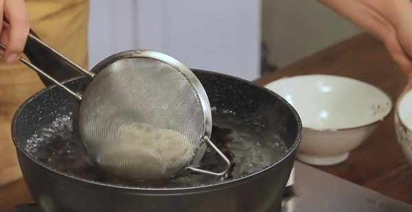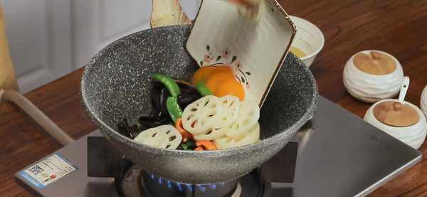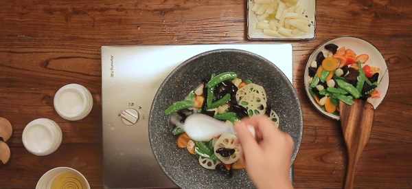 食材準備好之後,開火燒一小鍋水,往水裡加一勺鹽和一勺糖,這樣能讓炒出來的蔬菜顏色更加鮮亮。水少滾以後,用漏勺分先後順序把食材焯水:先放藕片、木耳、胡蘿卜和馬蹄,40秒鐘以後把荷蘭豆放進去,再一起焯20秒就可以撈起,放進一盆清水裡,防止氧化和過度加熱。然後把食材撈起瀝幹,開始進入炒制階段。一分鐘左右就能上桌開吃瞭。