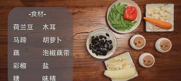 所需食材:荷蘭豆、木耳、 馬蹄、胡蘿卜、藕、泡椒藕帶(超市有現成的賣)、彩椒、糖、鹽、味精。