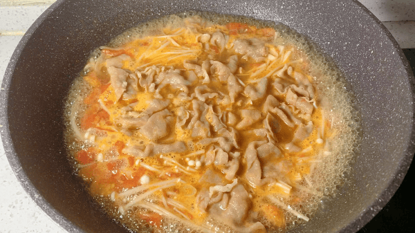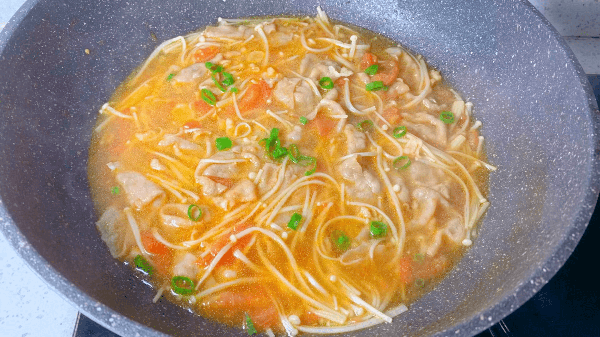 4、金針菇放入後,再倒入小半勺蠔油、1勺味極鮮、小半勺白糖和鹽,用勺子攪動,讓金針菇快速的受熱,金針菇煮至8分熟後,再放入煮熟後的肥牛,大火煮20秒即可。