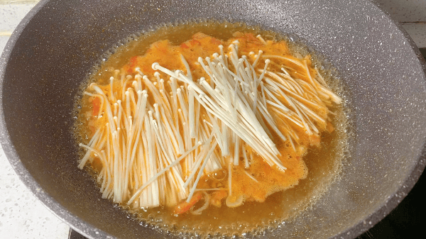 3、鍋中倒入少許的食用油,放入蔥薑炒香,再放入切好的西紅柿,西紅柿不停的翻炒,炒出裡面的沙汁,最後再倒入適量的清水,大火把水煮開後把金針菇放進去。