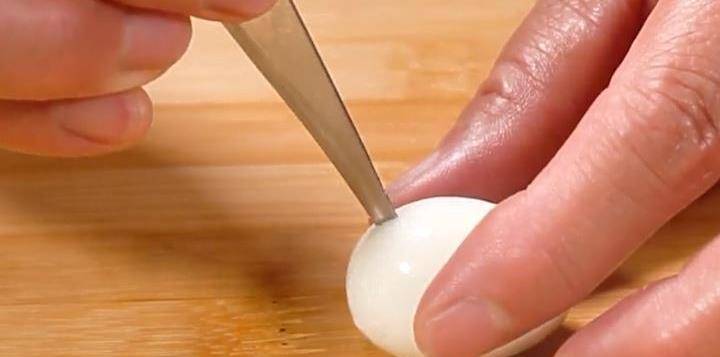 4、用小刀切一塊下來使鵪鶉蛋能站住,再用刀在鵪鶉蛋一頭和兩側輕劃一道刀口。