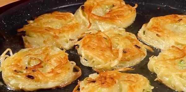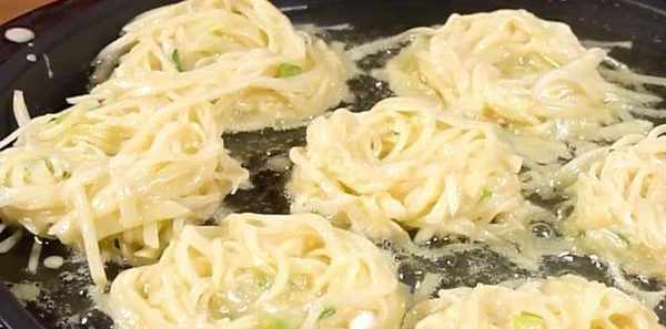 6、電餅鐺刷油,油溫四成熱,將土豆絲卷成鳥巢狀,下入電餅鐺煎制。