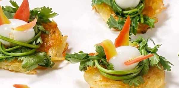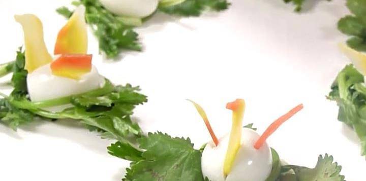 5、將胡蘿卜片切成鳥頸與頭還有翅膀的形狀,插在鵪鶉蛋的刀口裡,再用芹菜葉卷成環狀,鳥巢就做好瞭。