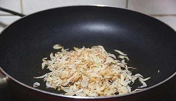 炒蝦皮建議用不粘鍋炒;用中小火把不粘鍋加熱,等鍋熱後放入蝦皮,翻炒至蝦皮變幹,然後盛出備用。