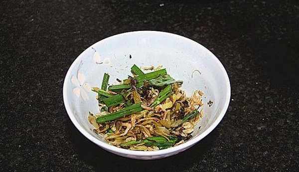 最後就是依個人喜好把以上準備好的食材混合瞭;取適量的酸菜、蝦皮、生蒜苗蒜葉段混合,再加少許花生油和生抽調鮮即可,酸菜是咸的,生抽別加太多。