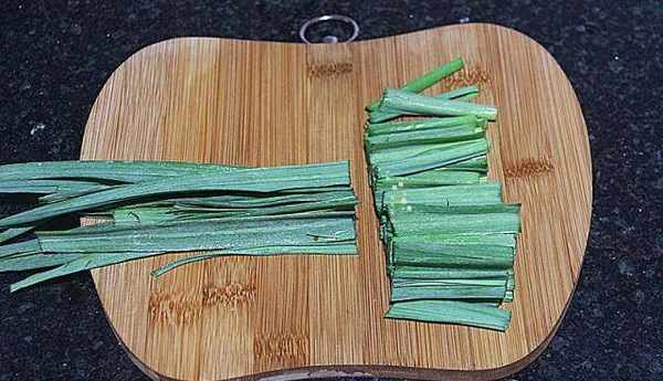 這一步也是傢鄉的特色,酸菜裡拌入生蒜苗,吃起來會有一點辣;把生蒜苗的頭須去除、尾部的黃葉子摘去扔掉,把生蒜苗放入清水裡仔細清洗,其中葉子之間小心掰開清洗、甩幹多餘水分,取蒜葉部分切出來、切成段。