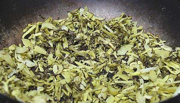 接著準備炒酸菜;把無水無油的鐵鍋用中小火加熱,再倒入切細碎的酸菜轉小火翻炒,等酸菜翻炒到看起來幹爽就可以熄火、攤開放涼,最後放入無水無油容器裡保存。炒好的酸菜不是一次吃完的,每次要夾取適量的,剩餘部分最好2天左右翻炒一次。