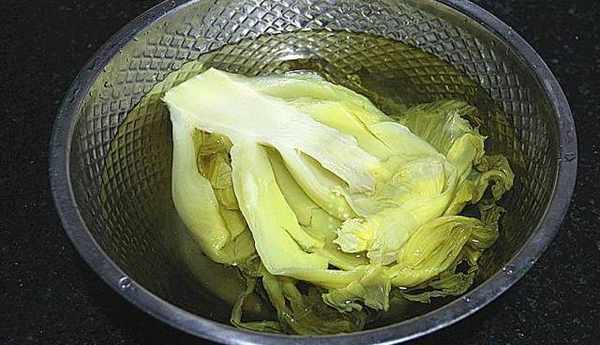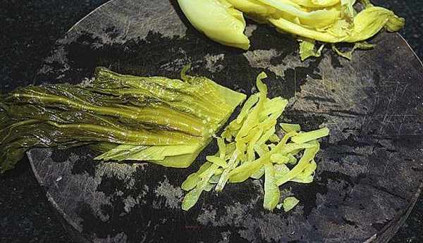 接下來,把浸泡清洗好的酸菜的葉子、桿分開,然後用刀把它們分別切細,盡量切細些;全部切好的酸菜要擠幹多餘水分,要去除多餘水分菜耐保存。