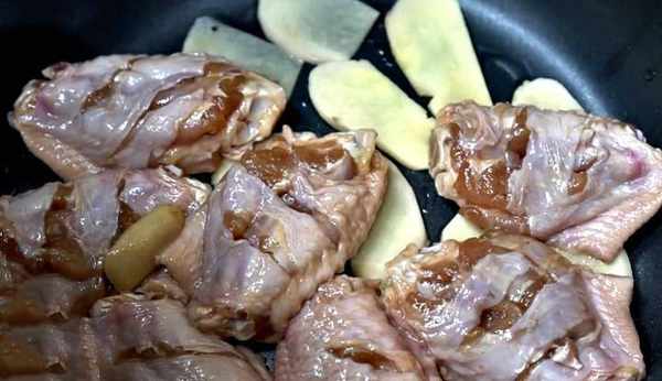 第二:在電飯煲的內膽裡,先鋪上一層薑片,再把雞翅均勻鋪在上面,這樣可以去除腥味,而且雞翅吃起來又香又好吃。