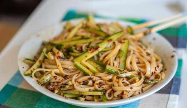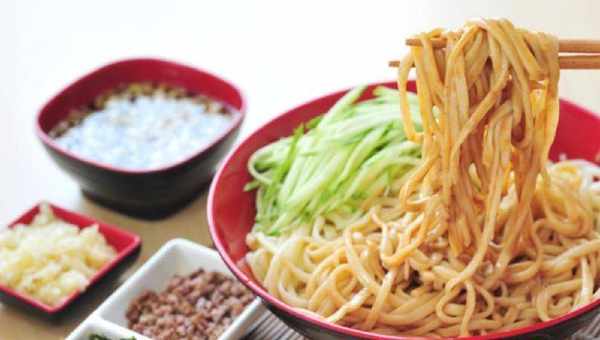 在吃的時候可以稍微放上一些胡椒粉,這樣的話會比較好吃。接下來的一個是涼拌掛面,我們需要黃瓜,掛面,蒜和蔥。要準備胡椒粉,辣椒粉和生抽。我們先把掛面都煮好,但是不要煮太長時間。把它撈出來之後先晾一晾,然後放上一些香油,稍微攪拌一下。這樣的話面條就不會都粘在一塊。在晾的時候呀,我們在切一下小蔥和蒜,然後放上胡椒粉。接下來把黃瓜切成絲。