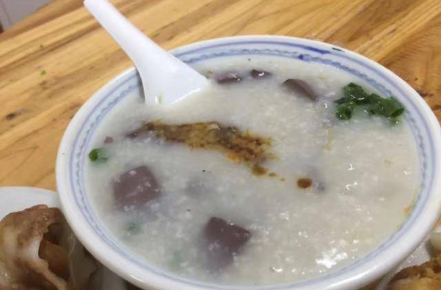 底粥用大米熬成綿綿的粥,豬紅是老板到屠場拿的,新鮮不摻入水。首先豬紅定型後用刀劃成塊,再用熱水炒成分開的固體塊狀,等客人需要的時候在現煮,加入薑絲,少許自釀糯米酒,最後裝碗開吃前,撒點胡椒粉,蔥花,醬油。老廣們喝粥怎麼也少不瞭醬油。另外豬紅能除塵,幫助肺部排毒哦。