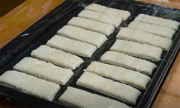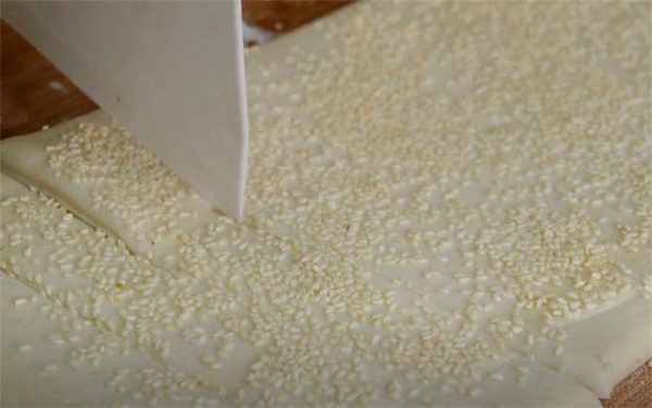 5.這樣重復三到四次之後,表面刷一層水,撒一些白芝麻增香,然後切成自己喜歡的形狀,我切瞭比較好拿的長條狀。