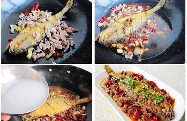 4、鍋裡留少許油,下蔥薑末辣皮子炒出香味,然後下炸好的黃花魚和焯好的羊肉片料酒醬油