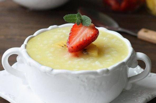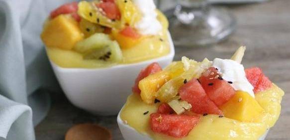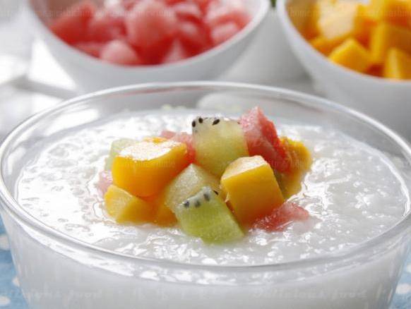 盛夏已經到來瞭,天氣越來越熱,想象一下,在你汗如雨下的時候,喝一口冰冰涼涼的水果甜粥是多麼愜意的事情。水果粥也是比較隨意的,自己喜歡什麼水果就加什麼水果吧,為瞭有豐富的色彩,我今天加瞭芒果、獼猴桃和西瓜,黃色、紅色、綠色都有啦。
