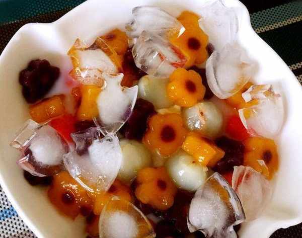 水果冰粥,在炎熱的夏日裡可以清清腸胃並涼爽去暑,蘋果冰粥、西瓜冰粥、荷葉冰粥、蘆薈百合冰粥等等琳瑯滿目,在冰凍的白粥裡面加入各種水果粒,白粥像潮洲粥一樣還能看到未化盡的米飯粒,水果粒則帶出瞭甜潤的感覺,很清淡,尤其適合夏天吃。