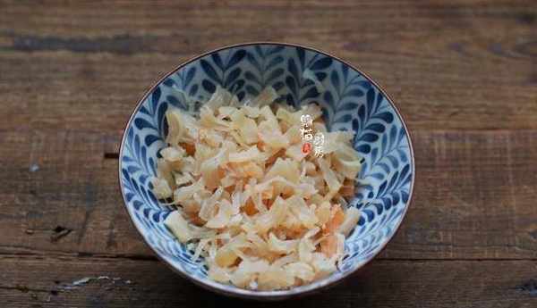 2.泡上一把幹貝,幹貝就是貝類海產品,傢裡冰箱經常備著一小袋,用來煲湯、熬粥味道都很鮮,還有淡淡的咸味。泡過的幹貝撕碎,這樣方便入味,如果早上時間比較匆忙,可以提前把幹貝浸泡好,用刀背輕輕拍扁,放冰箱冷藏也是可以的。