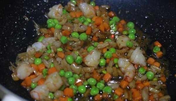 4.炒香瞭幹貝和蝦仁後,倒入準備好的青豆、胡蘿卜粒等,加1勺蠔油提提鮮,中小火煸炒熟蔬菜粒。