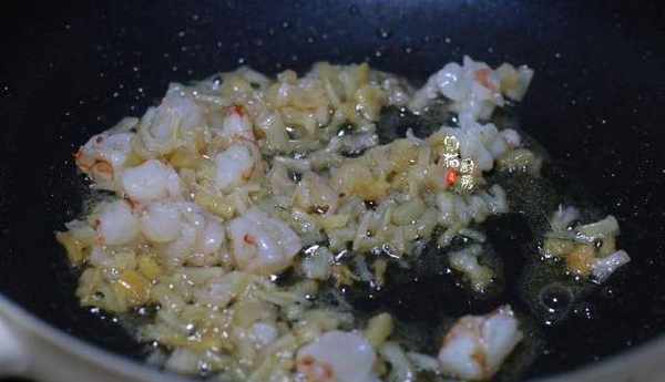 3.炒鍋燒熱,因為蝦仁含優質蛋白,所以倒入適量食用油加入幹貝炒香後,我又把準備好已經解凍的蝦仁倒入鍋中,翻炒出海鮮的香味。隻要不對海產品過敏的孩子,都可以在平時做菜的時候放些蝦仁搭配著,讓孩子營養好吸收。