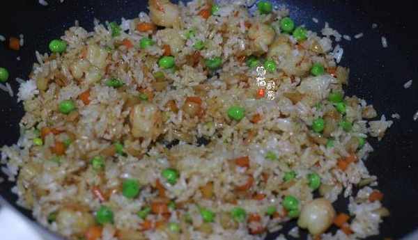 5.炒熟後把剩米飯倒入,改大火快炒,使米飯粒水分再炒幹一點,和幹貝蔬菜粒等食材混合均勻。最後加一勺生抽和適量鹽調味。翻炒均勻盛出鍋。