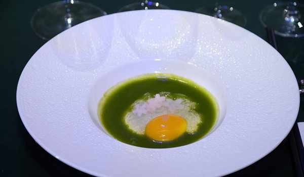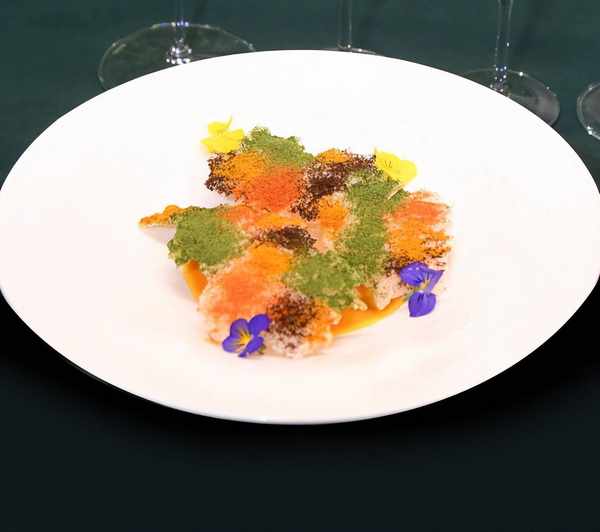 第一道主菜“露上青苔”由俞斌團隊創意呈現,將精心拆取的應季長腳蟹肉搭配上咖喱汁,口感綿密滋味香醇,覆上爽滑的小仙燉鮮燉燕窩加裡曼之星,造就瞭非同凡響的雙鮮之美,入口細膩而又層次豐富。最上層撒上五顏六色的粉末,與底部的咖喱湯汁交織,宛如潮濕的青苔覆蓋漫山遍野。晶瑩剔透的燕窩似晨間露水,在青苔間微光閃爍。品鑒中,仿佛將加裡曼丹島的盎然生機也吃進瞭肚子裡。